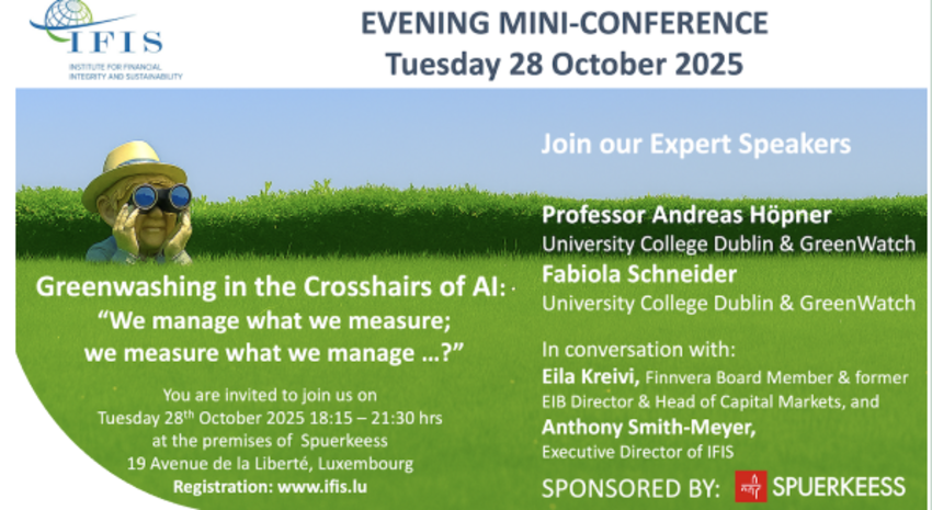 On 28 October 2025, the Institute for Financial Integrity and Sustainability (IFIS) invites you to an evening mini-conference titled “Greenwashing in the Crosshairs of AI”, held at Spuerkeess, Centre Bancaire 19 Liberté in Luxembourg. The event will explore how artificial intelligence is being used to detect and address greenwashing in financial markets.