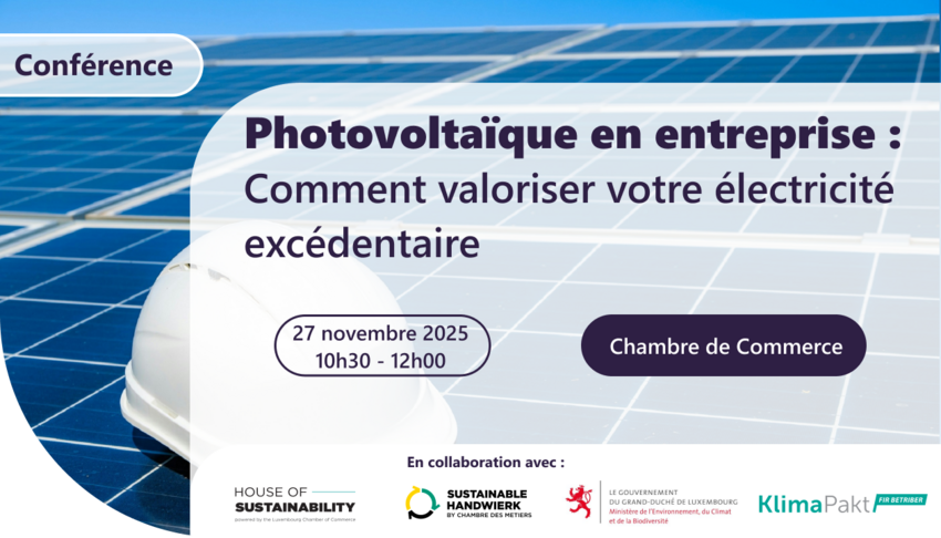 Dans le cadre du Sustainability Cycle du mois de novembre, la House of Sustainability a le plaisir de vous inviter à notre conférence intitulée « Photovoltaïque en entreprise : Comment valoriser votre électricité excédentaire » qui se tiendra le 27 novembre 10h30 à 12h00 à la Chambre de Commerce. Cet événement est organisé par la House of Sustainability de la Chambre de Commerce, en collaboration avec Klima-Agence et Luxinnovation dans le cadre du Klimapakt fir Betriber ainsi que, la Chambre des Métiers et le Klimaprogramm, soutenu par le ministère de l’Environnement, du Climat et de la Biodiversité.