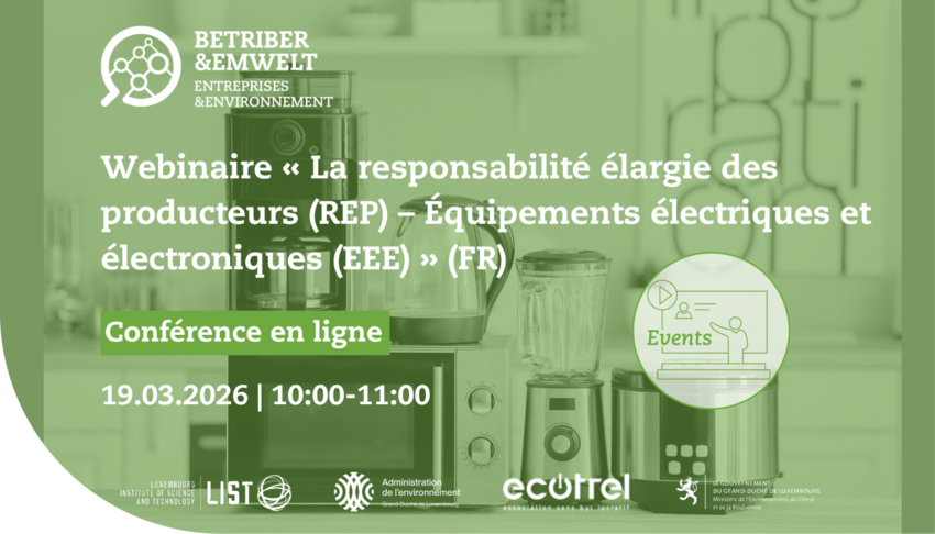 La plateforme Betriber&Emwelt organise, en collaboration avec l'Administration de l'environnement (AEV) et Ecotrel, un webinaire concernant la mise en place du régime de responsabilité élargie des producteurs, spécifique aux équipements électriques et électroniques (EEE).