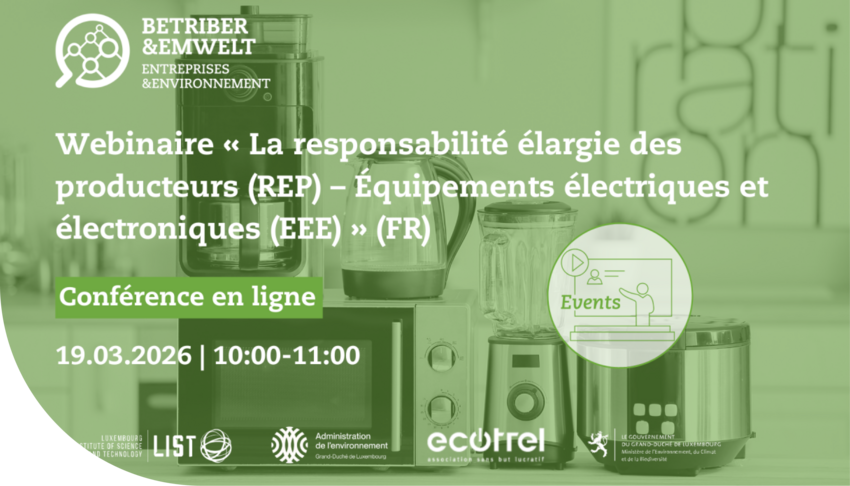 La plateforme Betriber&Emwelt organise, en collaboration avec l'Administration de l'environnement (AEV) et Ecotrel, un webinaire concernant la mise en place du régime de responsabilité élargie des producteurs, spécifique aux déchets d’équipements électriques et électroniques (DEEE).